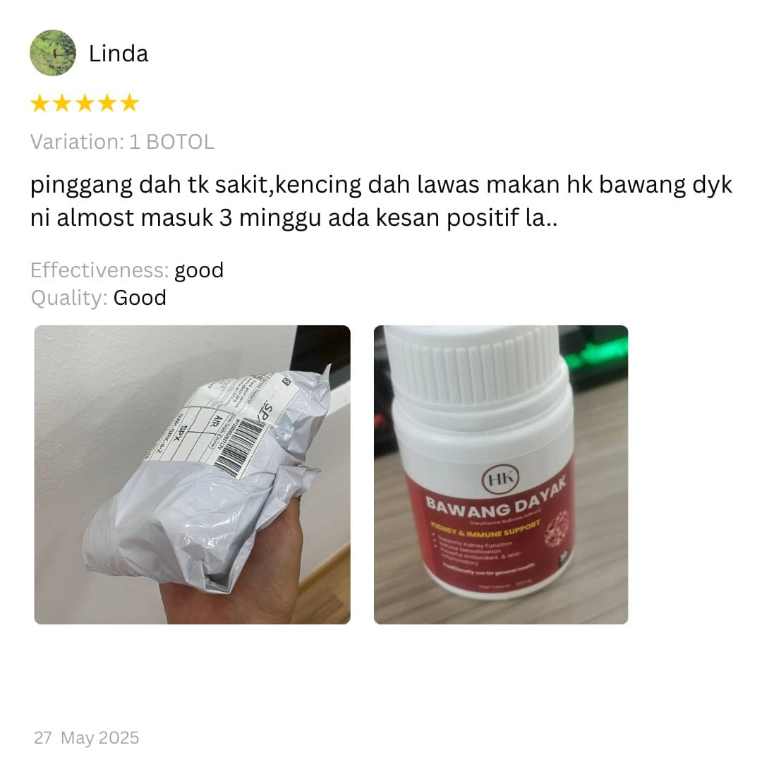 Hasil Konsisten Menggunakan Bawang Dayak dapat bantu Tekanan oksidatif kronik, Keradangan dalaman, Tambah tenaga, Menyokong Tubuh & Kurangkan masalah kencing manis.